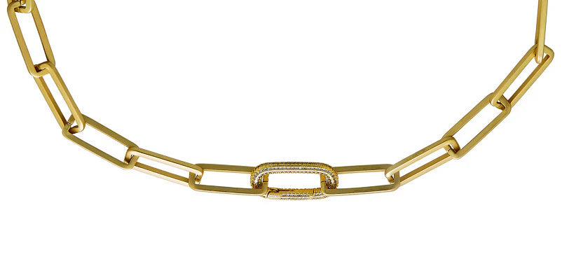 A modern-day classic from our collection, this chunky matte gold necklace is undeniably chic. Crafted to emanate strength and femininity, this piece never fails to elevate any look, with its chunky rectangle chain links and oval pave clasp.