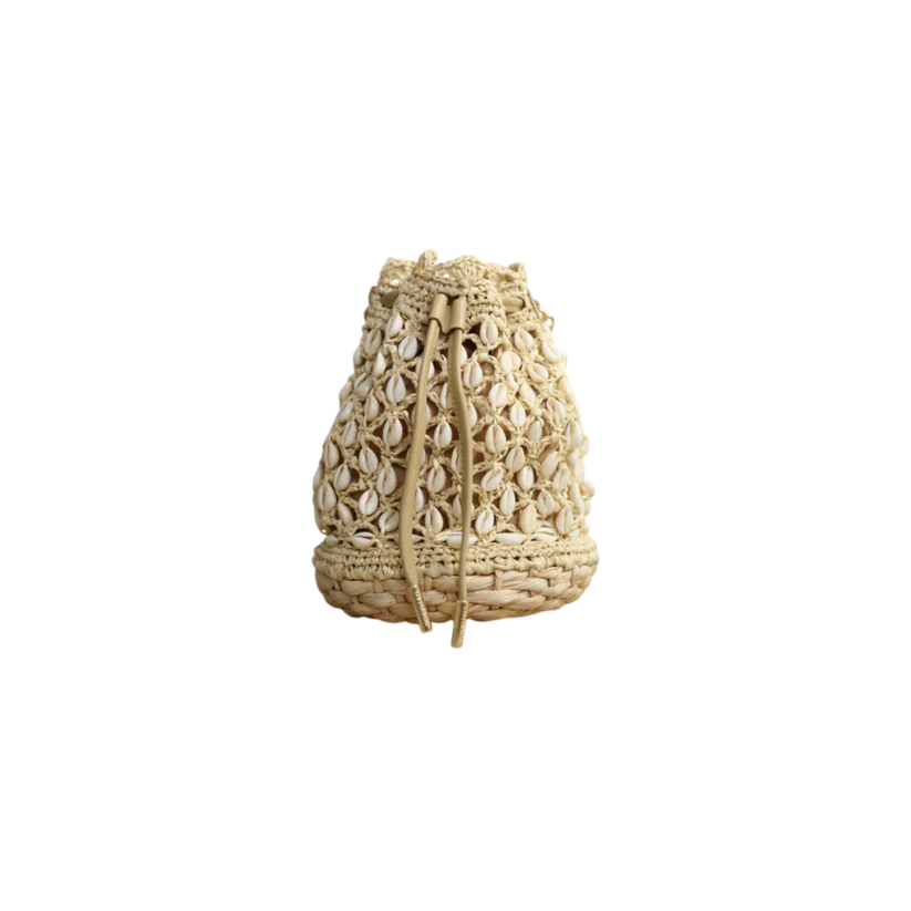 The Plage Conch bag is a bucket bag with natural raffia and straw crochet, embellished with natural shells. It features a resin pearl handle, a twisted shoulder strap, satin lining with a twisted cord closure.