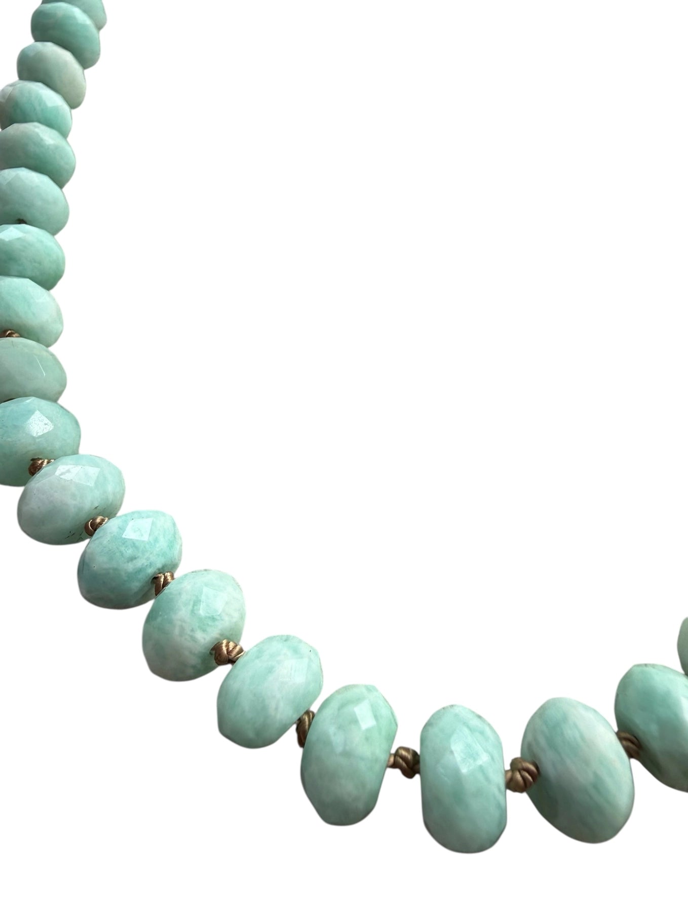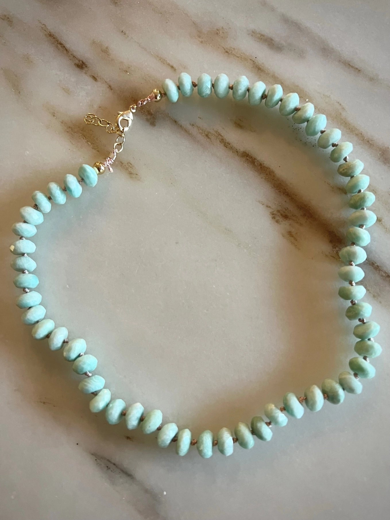 The Sophie's Necklace features peruvian amazonite stones on a hand knotted on high quality sturdy silk thread. Length is 16-18" with an extender chain.