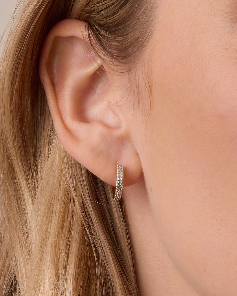Elevate your ear stack with the Wilder Shimmer Bar Huggies. Featuring a sparkling design, these huggies are perfect for a night out or dressed down with your favorite jeans and white tee.