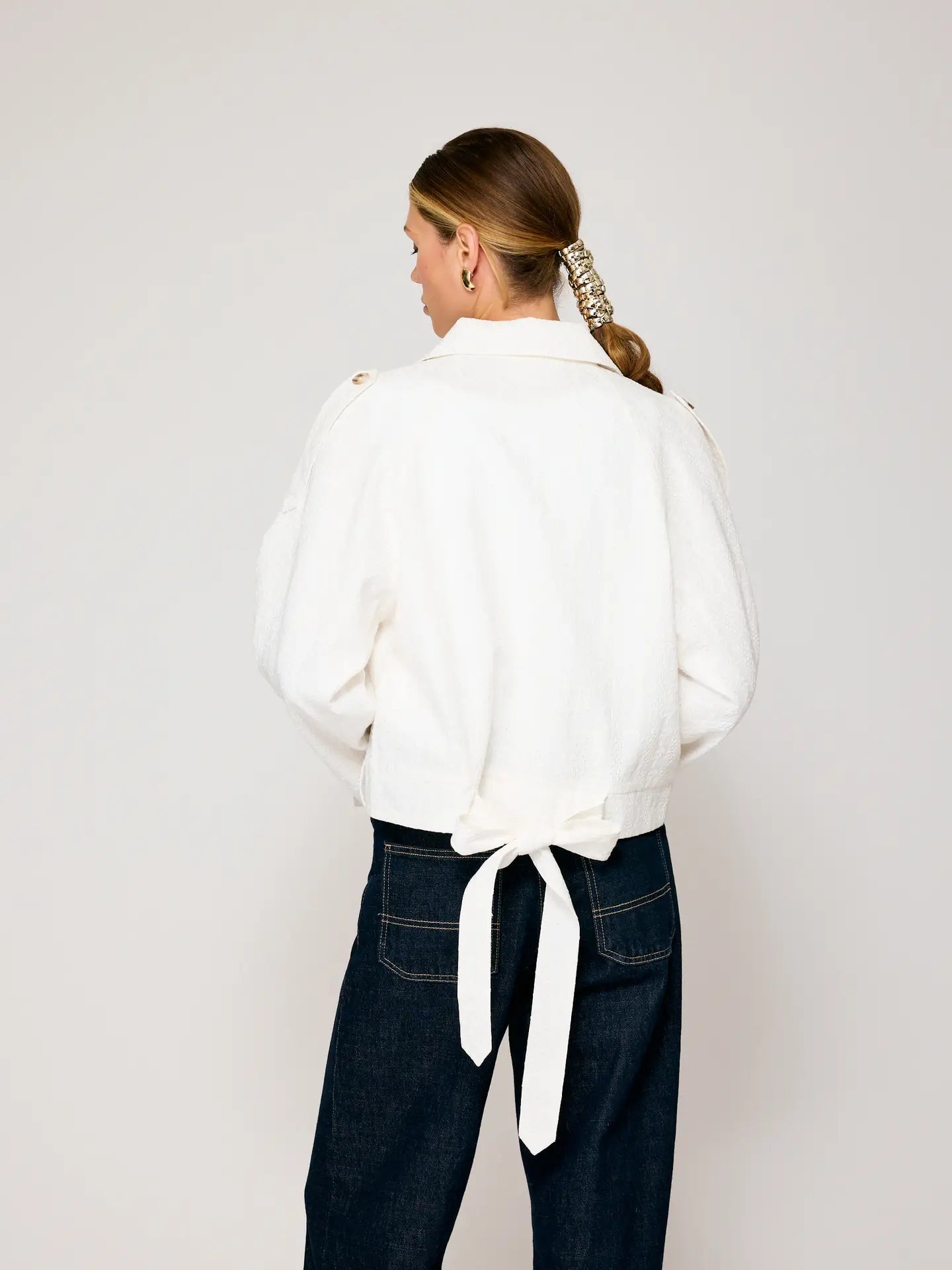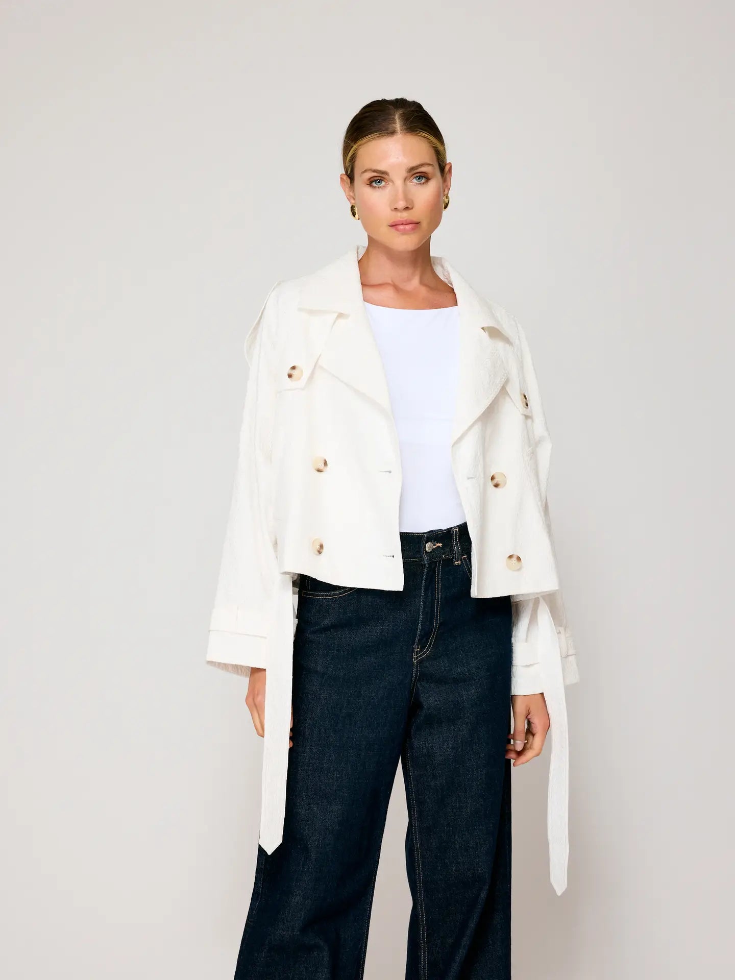 The Bendetta Crop Trench Jacket by Line & Dot is an embodiment of simplicity and femininity. Made from 100% cotton, with a lining blend of viscose, polyester, and nylon, this piece offers comfort with a modern aesthetic.