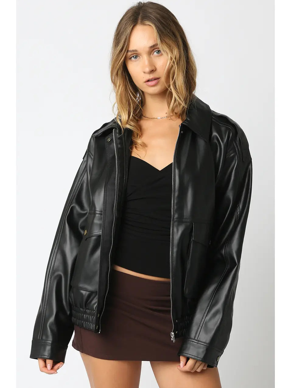 Our Carina Pu Jacket features a pocket and a high collared detail.