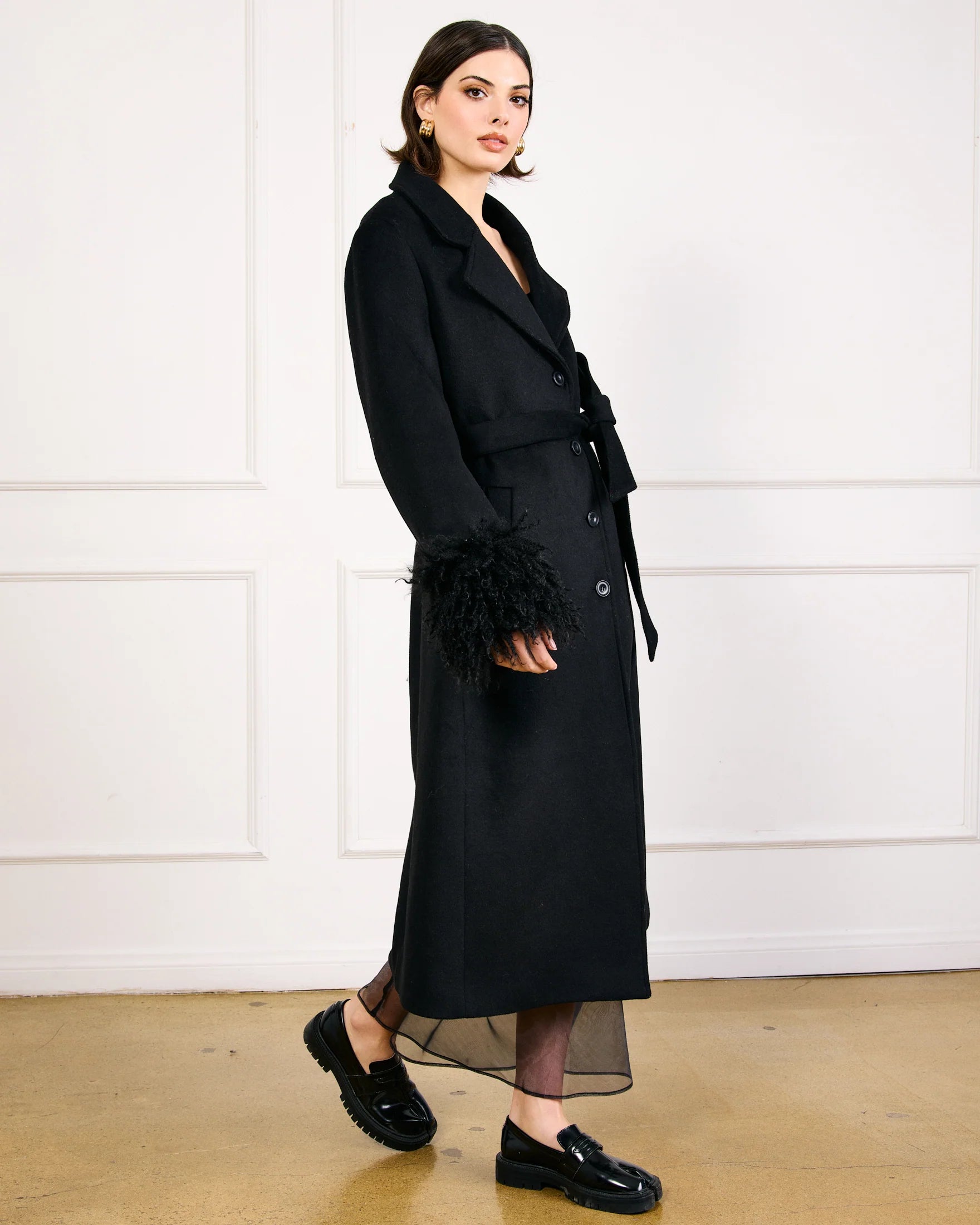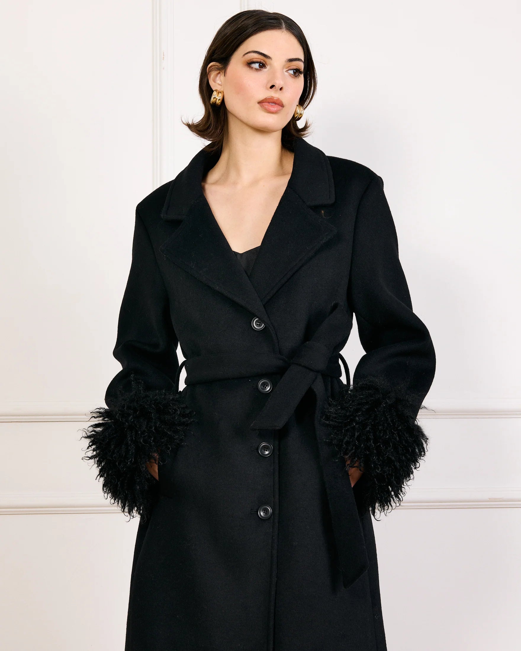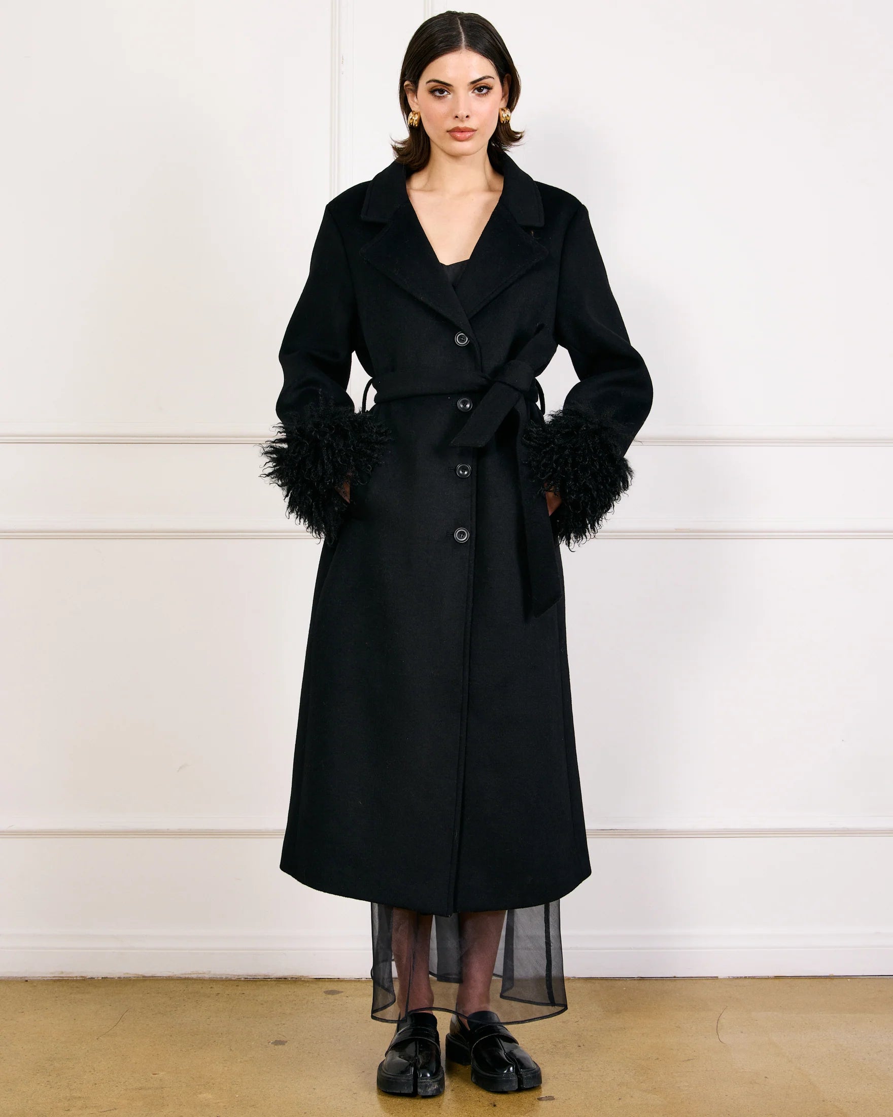 The Loxley Coat elevates any look, leaving an instant impression. The coat features a faux Mongolian fur details at the cuffs, button front closure, and detachable belt in a wool blend felt fabrication.