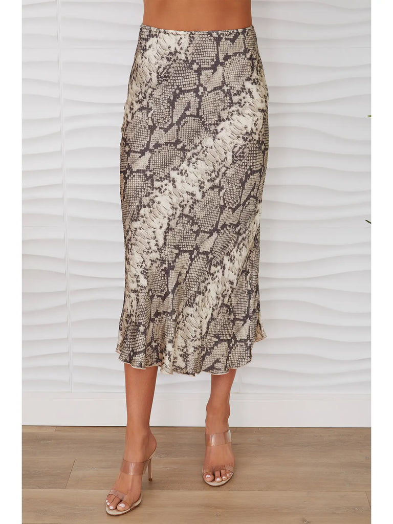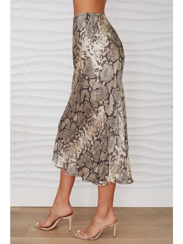 Expertly crafted from the finest silk, our python print silky midi skirt is a must-have for any fashion-forward wardrobe. With its eye-catching python print and sleek, midi length, this skirt adds a touch of sophistication to any outfit. Made with high-quality materials, it's both comfortable and stylish, making it perfect for any occasion. Elevate your style game with this unique and versatile piece.