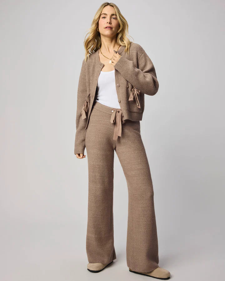 A cardigan with a luxe twist. The Stassi Satin Tie Cardigan is crafted from a cozy ribbed knit and elevated with satin bow details at the pockets. Perfect for layering, this button-front style blends everyday ease with a touch of polish.