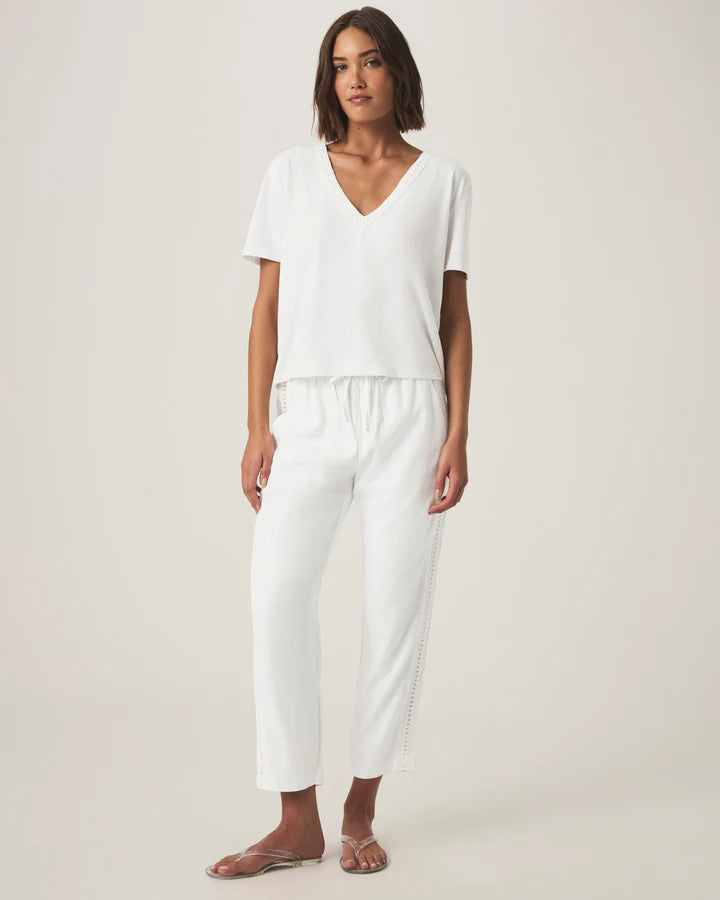 The Kacey Crochet V-neck Tee features pretty lace trim along the neckline. Its relaxed fit and raw edges balance out the delicate lace detailing for a versatile top that works well with any bottoms.