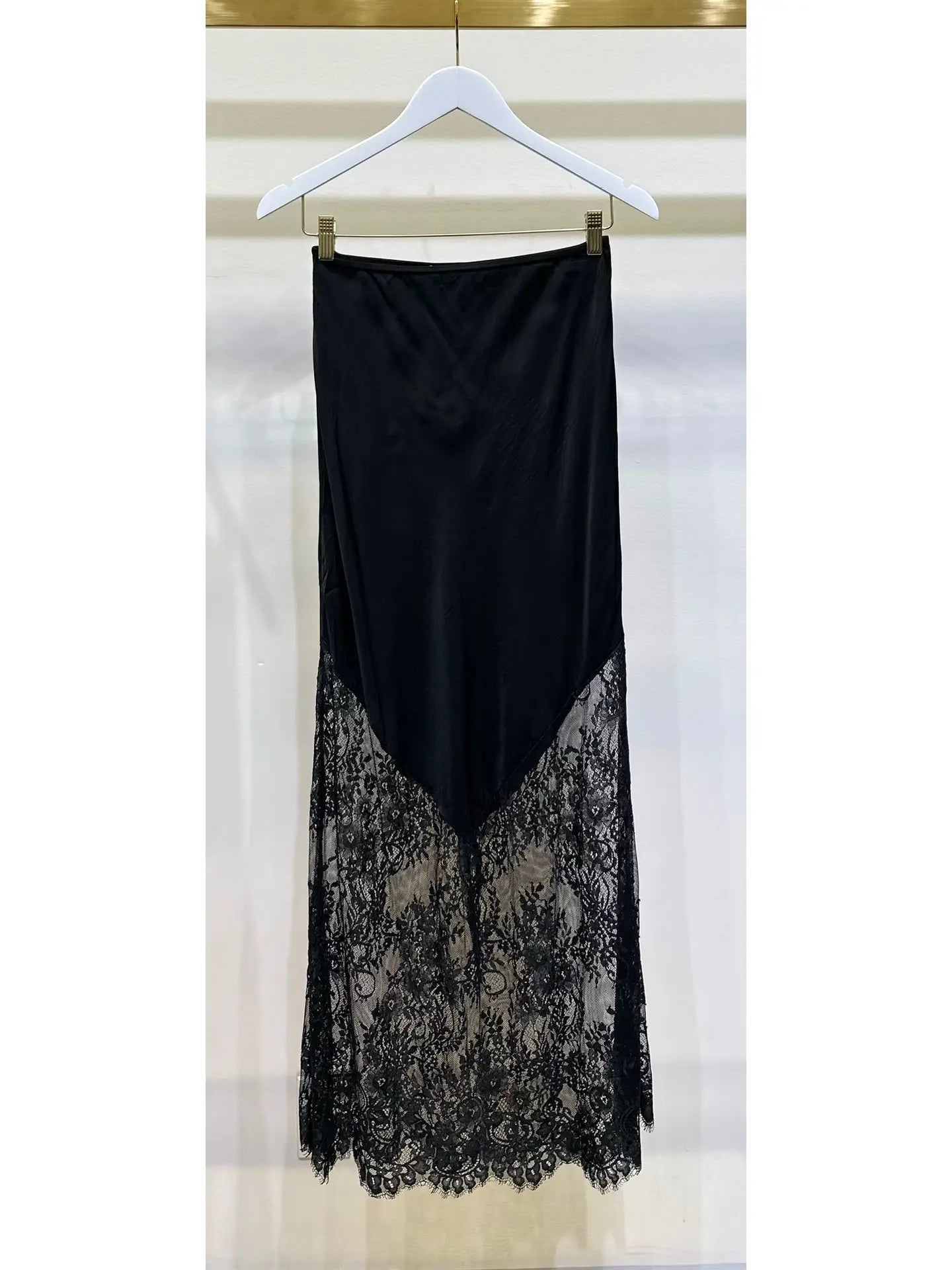 Upgrade your wardrobe with our stylish viscose maxi skirt! Made with a comfortable and flowy material, this skirt features a delicate lace hem for an added touch of elegance. Effortlessly elevate your look and feel confident in this must-have piece.